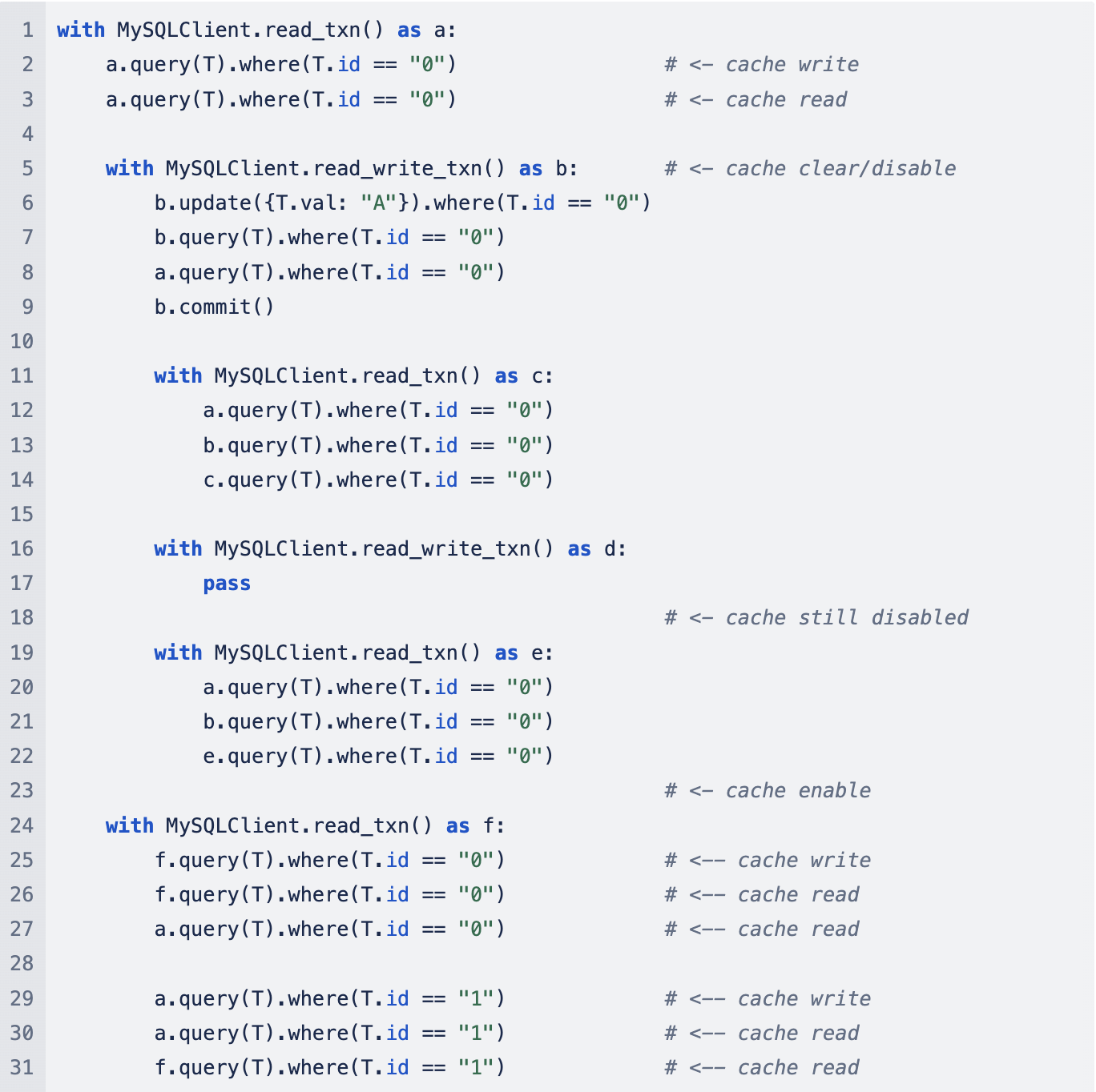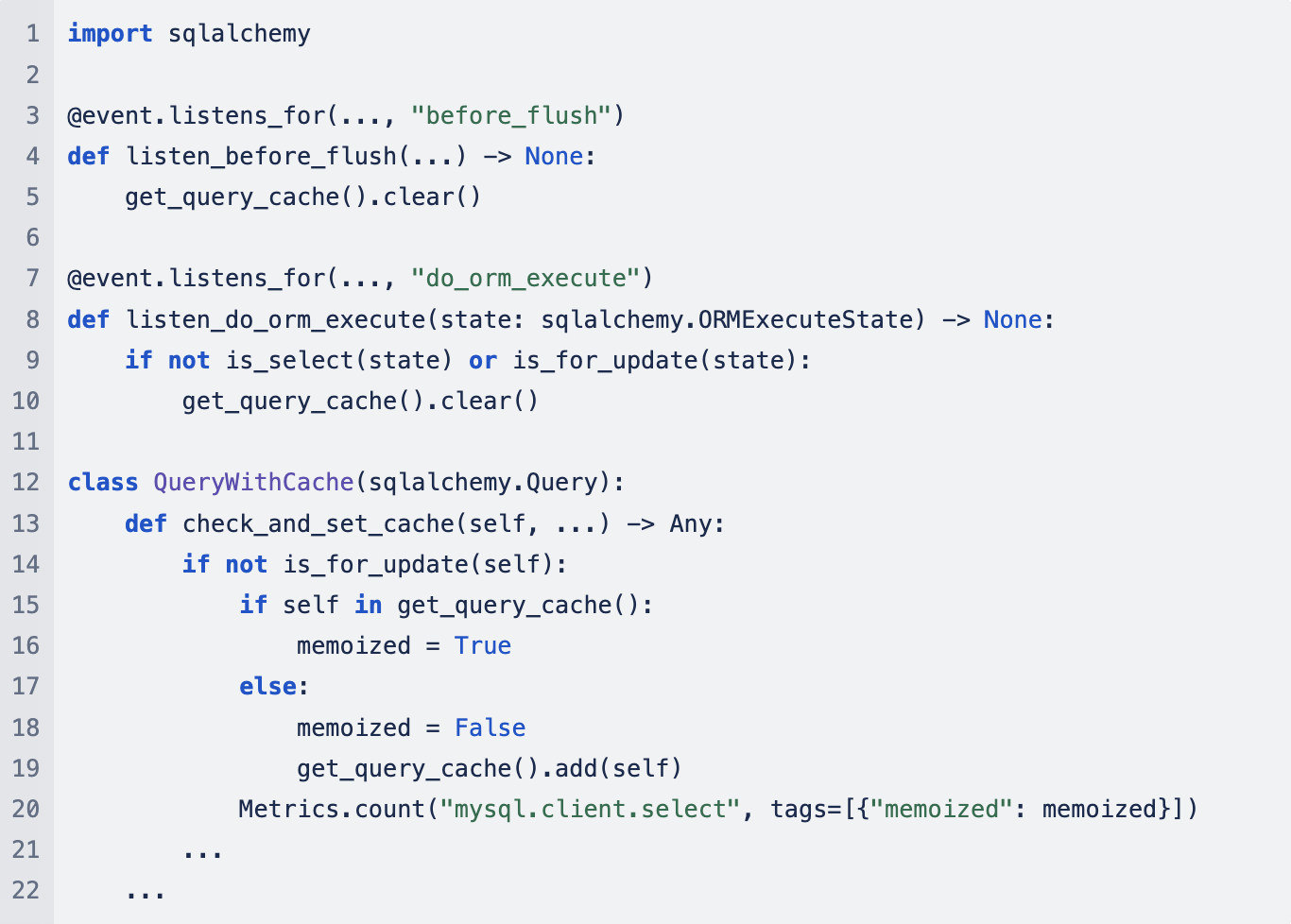 Before we could build the solution, we had to take on some preliminary work. Our codebase was using read/write transactions everywhere, including for business logic that did not need to perform writes. This meant that our proposed algorithm would be useless, given that it clears and disables the cache every time a read/write transaction is active. In order to leverage our algorithm effectively, we would need to migrate our entire codebase of ~1.5 million lines of Python to using read-only transactions wherever possible.