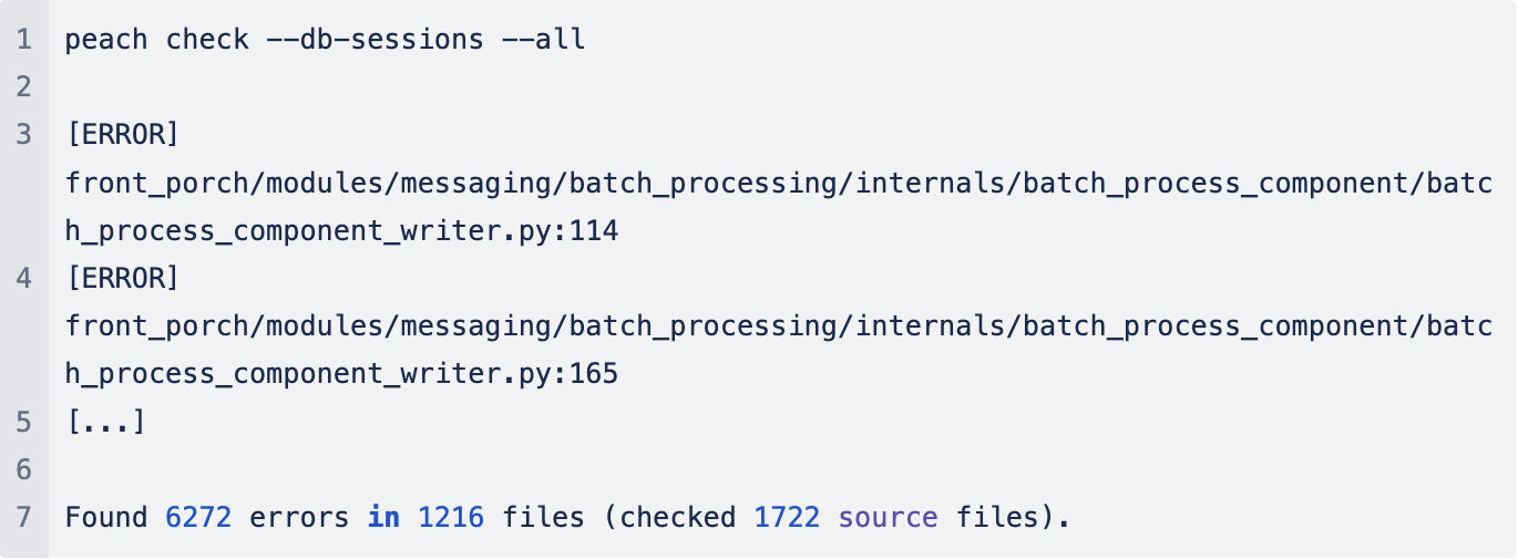 We added the static analysis tool to our internal peach tool—a command line interface (CLI) used to run commands for developer velocity (e.g., type-checkers, formatters, and code generators), which could be invoked via peach check --db-sessions. The optional --changed or --all flags (defaulting to --changed) would tell the command to check changed files or all files, respectively.